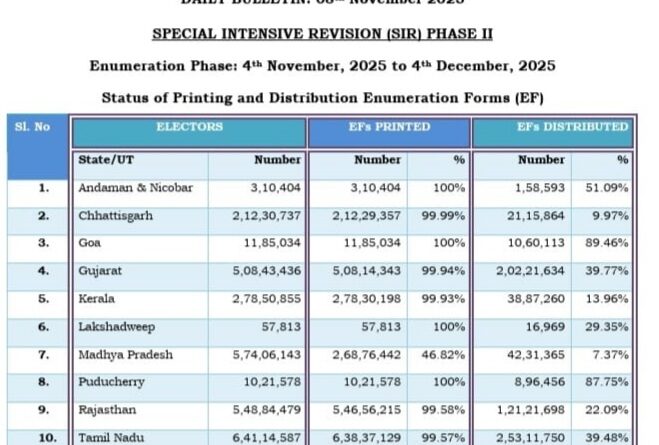 এনুমারেশন ফর্ম বিলিতে ১২ নির্বাচনমুখী রাজ্যেগুলির মধ্যে সেরা পারফর্মার পশ্চিমবঙ্গ