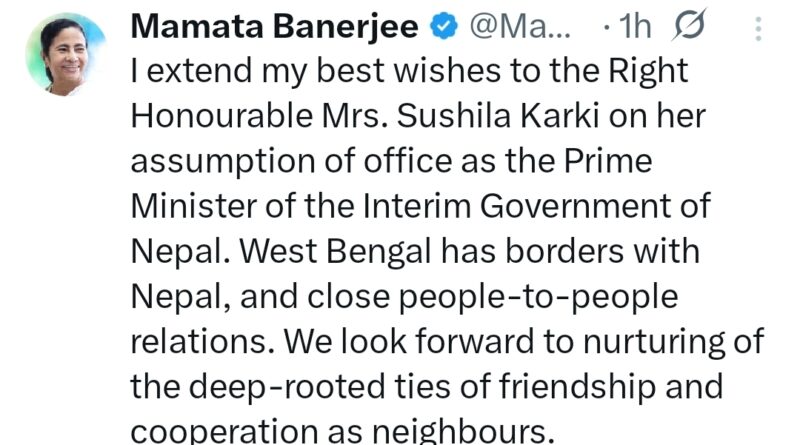 নেপালে অন্তর্বর্তী সরকারের প্রধান সুশীলা কারকিকে শুভেচ্ছা মুখ্যমন্ত্রীর