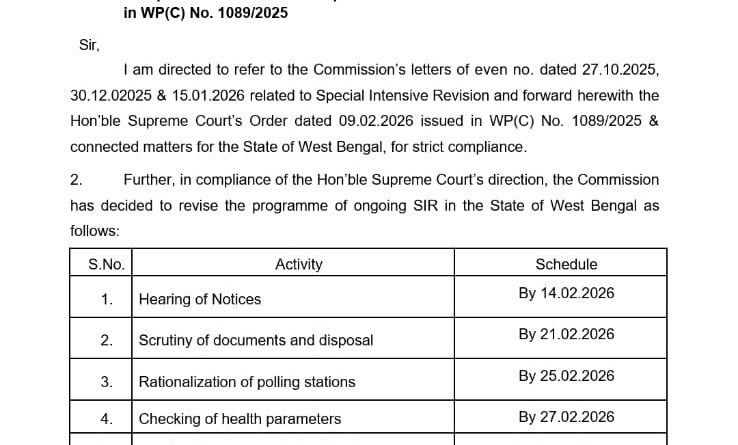 তা আরও দুই সপ্তাহ পিছিয়ে ২৮ ফেব্রুয়ারি তালিকা প্রকাশের দিন ধার্য করল কমিশন। নির্বাচন কমিশনের তরফে জানানো হয়েছে, ৯ ফেব্রুয়ারির সুপ্রিম কোর্টের নির্দেশের প্রেক্ষিতে এই সিদ্ধান্ত নেওয়া হয়েছে এবং সংশ্লিষ্ট সব দফতরকে তা কঠোরভাবে মানার নির্দেশ দেওয়া হয়েছে। নতুন সূচি অনুযায়ী, নোটিস সংক্রান্ত শুনানির কাজ শেষ করতে হবে ১৪ ফেব্রুয়ারির মধ্যে। নথি যাচাই ও নিষ্পত্তির কাজ চলবে ২১ ফেব্রুয়ারি পর্যন্ত। পাশাপাশি ২৫ ফেব্রুয়ারির মধ্যে ভোটগ্রহণ কেন্দ্রগুলির পুনর্বিন্যাস বা র্যাশনালাইজেশন এবং ২৭ ফেব্রুয়ারির মধ্যে প্রয়োজনীয় পরিকাঠামোগত পরীক্ষা সম্পন্ন করার কথা বলা হয়েছে কমিশনের নির্দেশিকায়। নির্বাচনকে সামনে রেখে তালিকা সংশোধনের কাজ নির্ধারিত সময়ের মধ্যেই শেষ করতে তৎপর কমিশন।